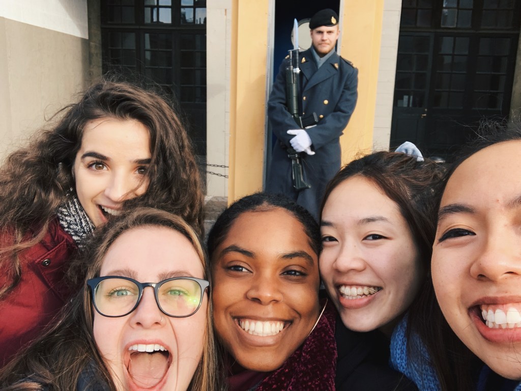 Next, we headed to the Royal Palace. On the walk over it started flurrying! This was the first time I have seen snow since last semester in Syracuse. I hate to admit it, but I do miss the snow. At the Royal Palace we saw the actual changing of the guards coincidentally and I made it my mission to get one of them to smile. Somehow, I succeeded.